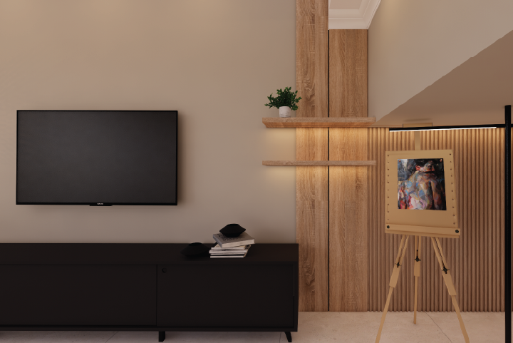 In designing the living room, we aimed for a clean look by concealing wires and sockets, creating a visually appealing space for the owner. The TV wall seamlessly connects to her daughter’s painting area, ensuring harmony in the overall design. Existing furniture, such as the TV console and floor lamp, were integrated to maintain balance. The foyer was thoughtfully designed to include shoe storage and a mirror, enhancing functionality. Additionally, a cozy sleeping nook was created for Mochi, providing her a favorite spot for napping.